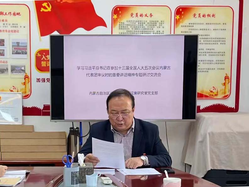 3月16日,少数民族古籍征集研究室党支部在集体学习和党员自学的基础上,围绕学习习近平总书记在参加十三届全国人大五次会议内蒙古代表团审议时的重要讲话精神开展专题研讨。