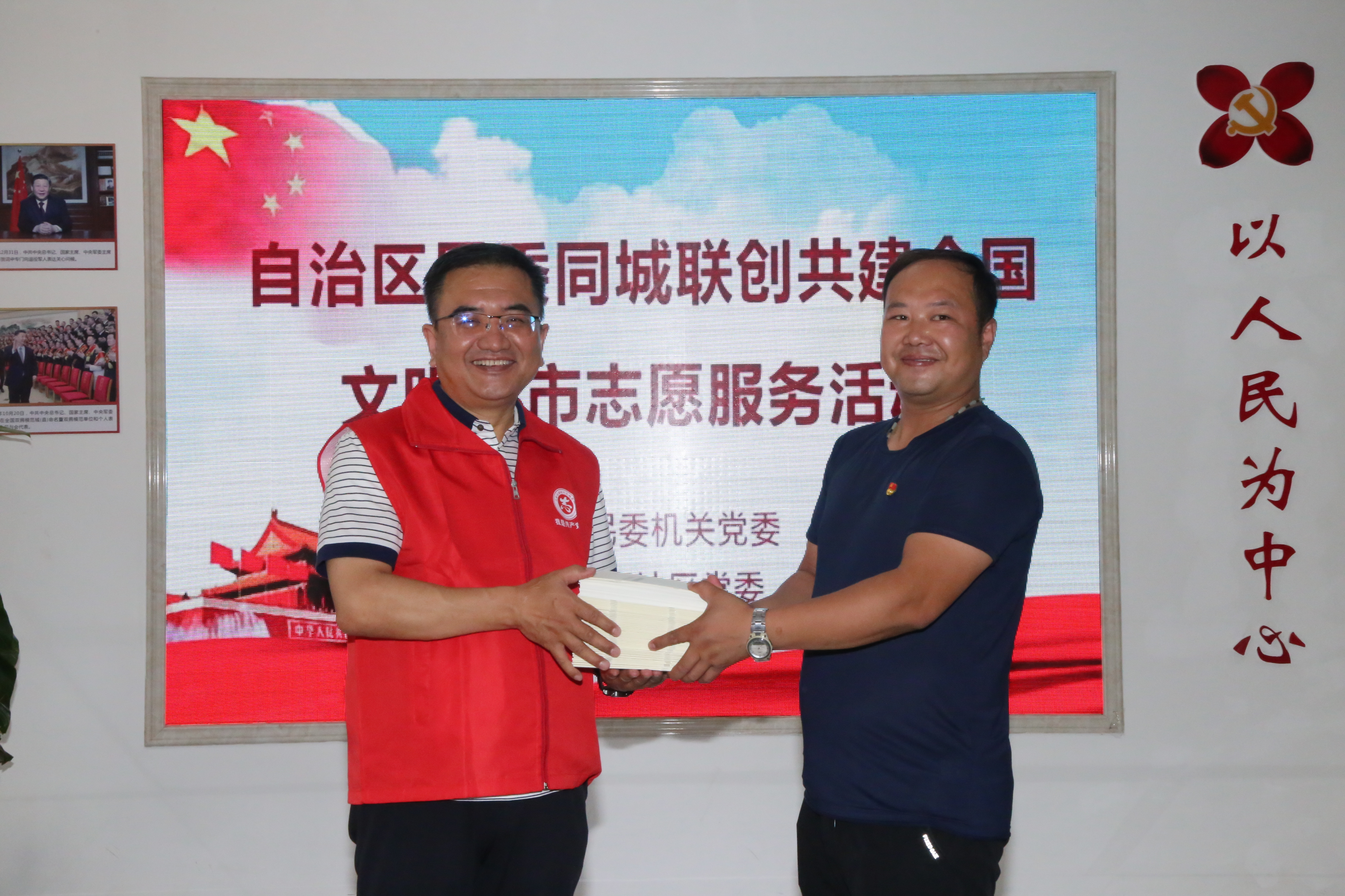 8月12日,伟德体育官网机关组织党员干部深入到包联社区——通道北街社区富邦小区开展同城联创共建全国文明城市志愿服务主题党日活动。伟德体育党组成员、副主任闫慧龙、康宇凤,二级巡视员毛权参加了活动,并向包联社区赠送了党的民族政策法规书籍,参观了包联小区垃圾分类积分兑换项目。