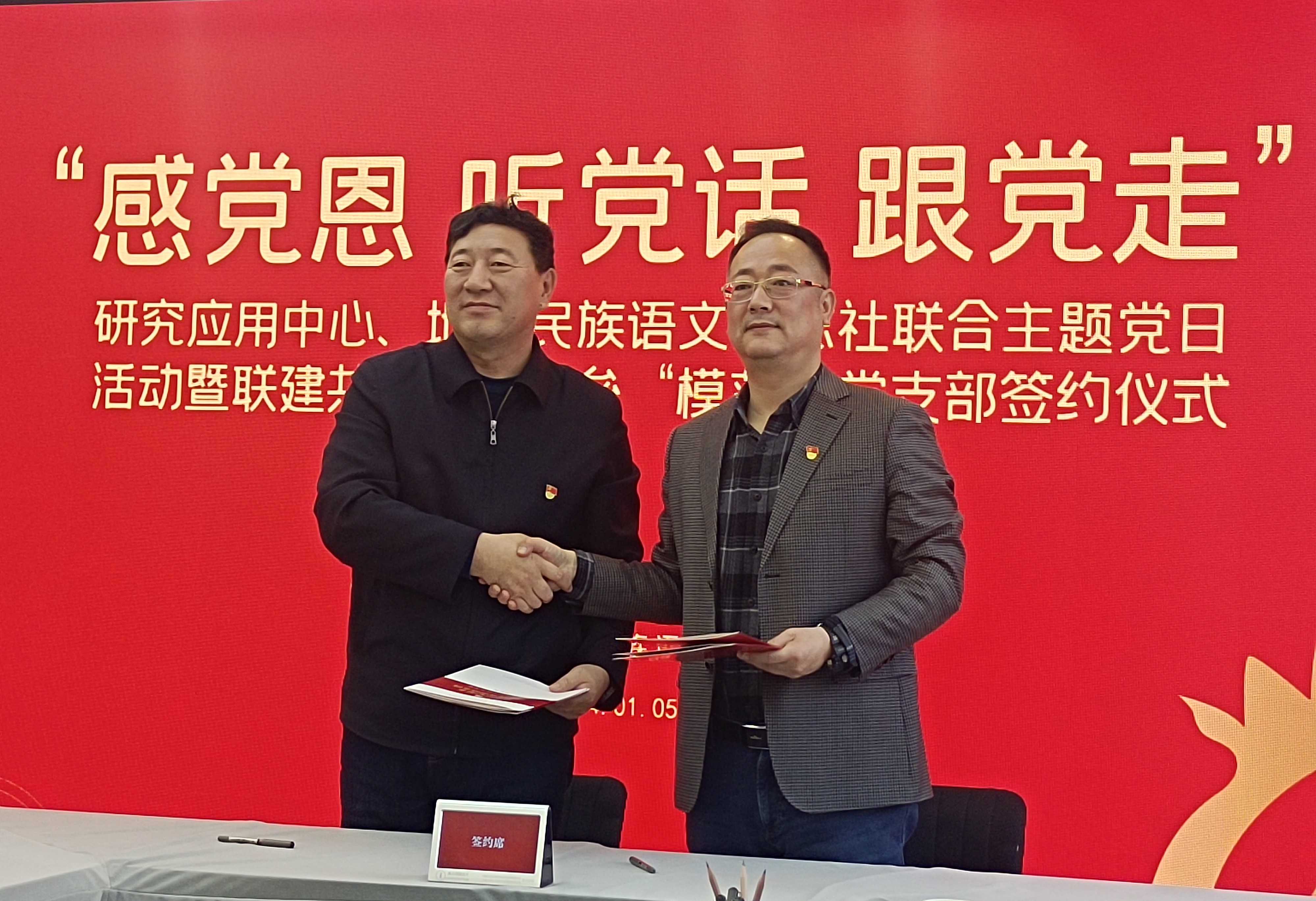 1月5日,内蒙古自治区地方语言文字研究应用中心和内蒙古地方民族语文杂志社党支部联合开展“感党恩 听党话 跟党走”主题党日活动暨联建共创坚强堡垒“模范”党支部签约仪式。