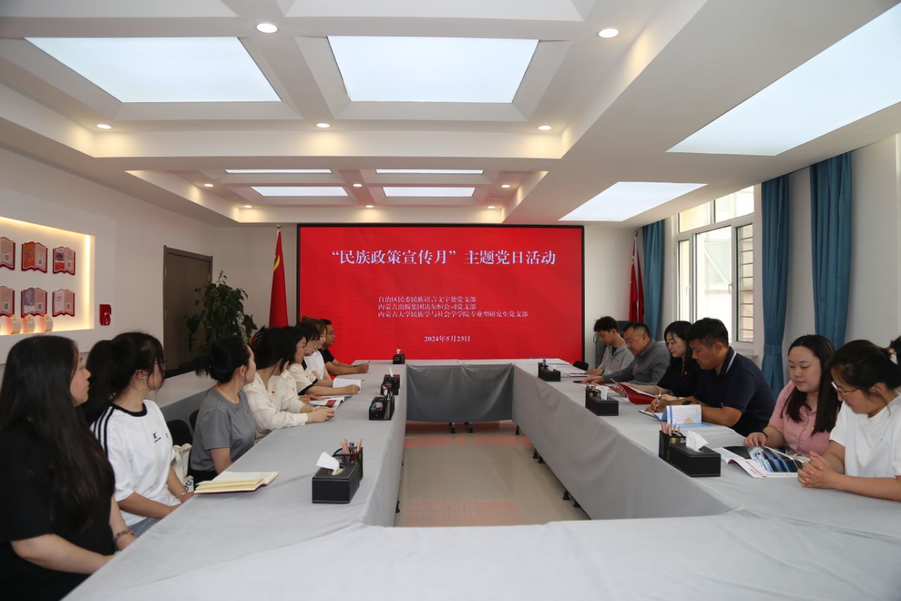 5月23日,为深入贯彻习近平总书记关于加强和改进民族工作的重要思想和对内蒙古的重要指示精神,推动民族政策宣传月活动走深走实,伟德体育民族语言文字处党支部联合内蒙古大学民族学与社会学学院专业型研究生党支部、内蒙古出版集团达尔恒公司党支部开展了“民族政策宣传月”主题党日活动。
