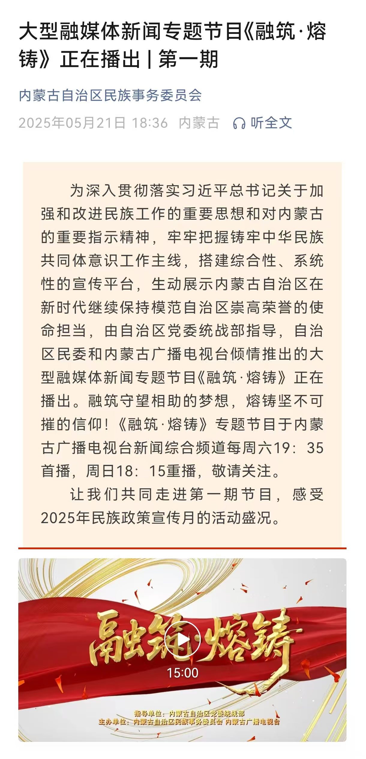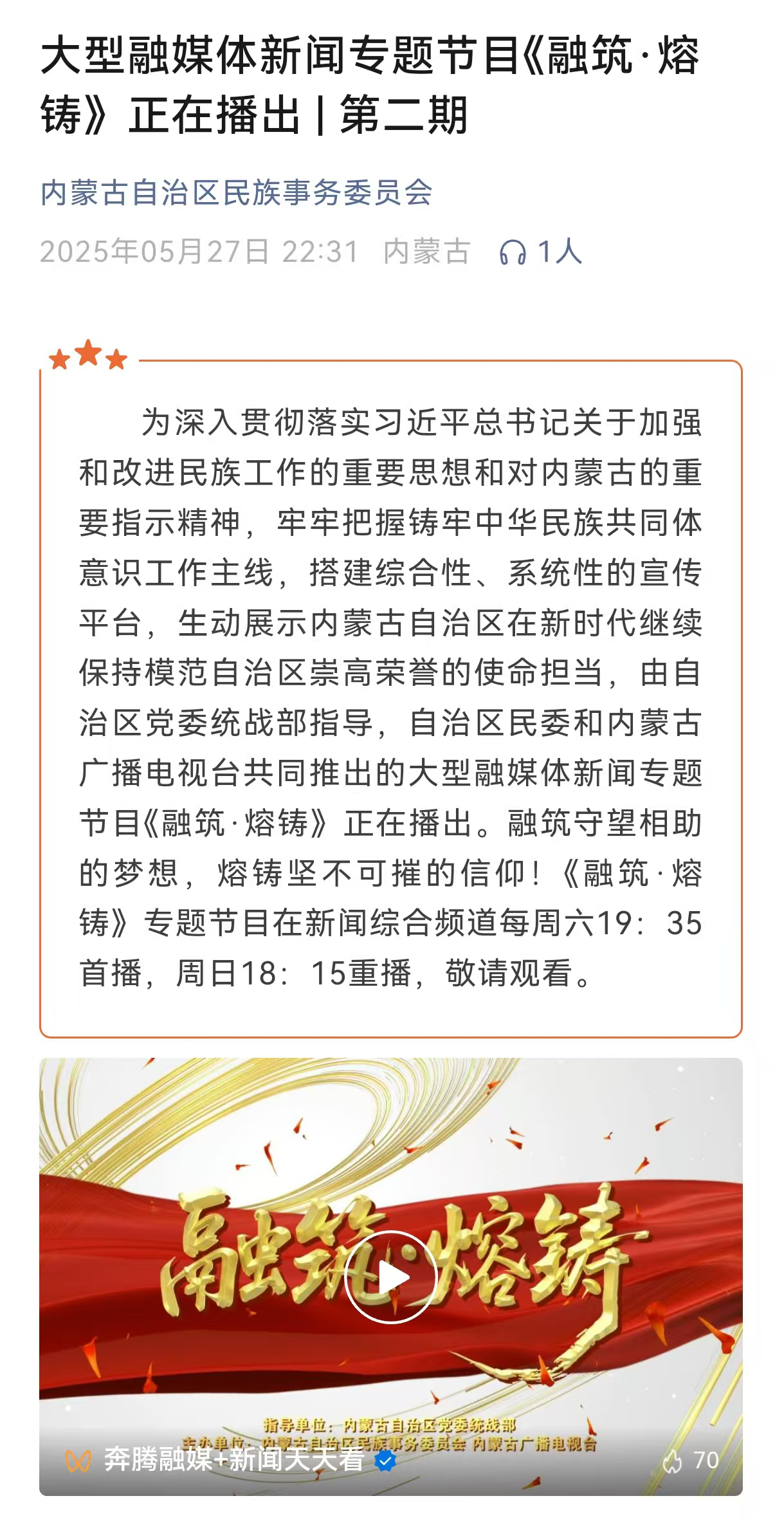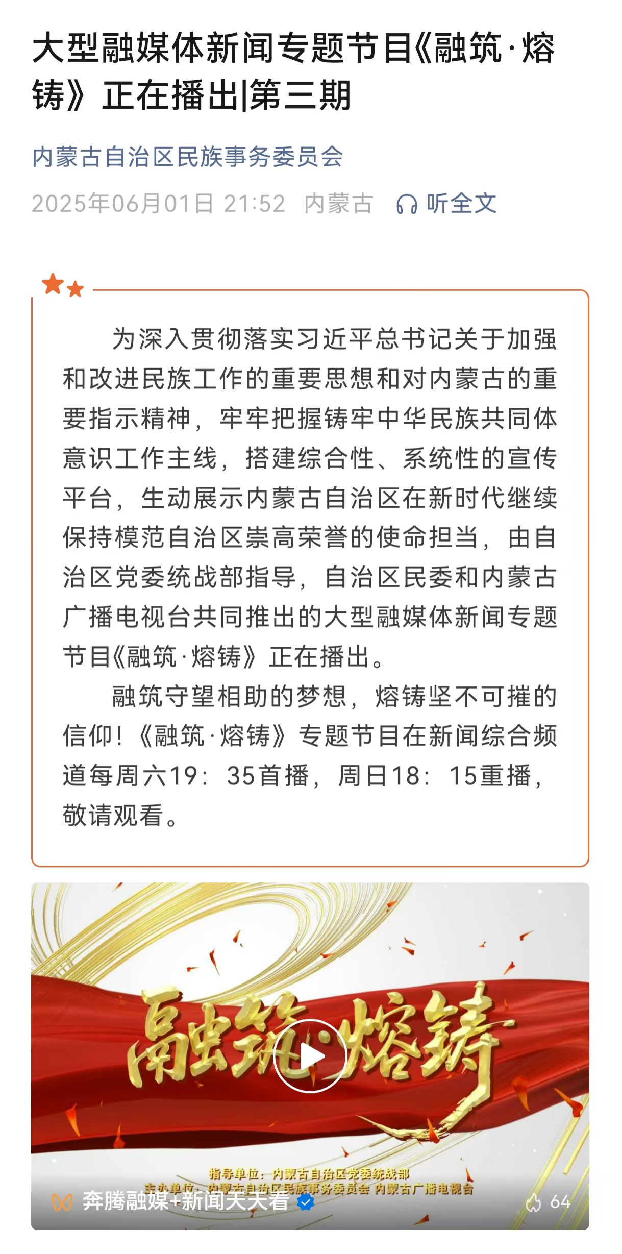 二是创新“互联网+”宣传矩阵,实现线上宣传有声有色。设计制作并通过网络发布宣传月主题宣传系列海报46张,获得各地各部门广泛转载使用;深入开展党的民族理论政策网络有奖竞答活动,参与人次超56万;与内蒙古广播电视台合作推出3期融媒体新闻专题节目《融筑·熔铸》,全网播放量60万次;协调通信管理局推送主题公益短信3000余万条,实现宣传触达率100%。创新开展党的民族理论政策和法律法规“9+N进”,通过微信、微博、抖音号等平台推送系列报道,刊发图文、视频等128万余条,传播量超76.8亿次。