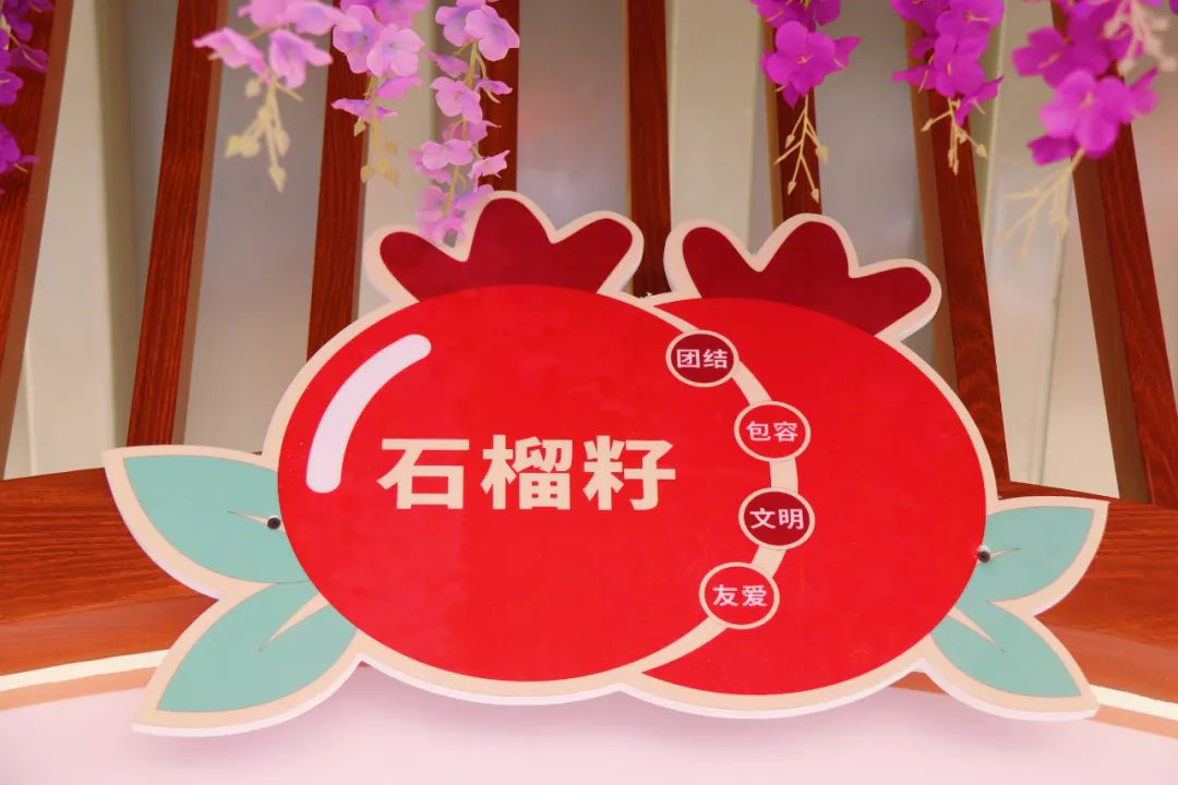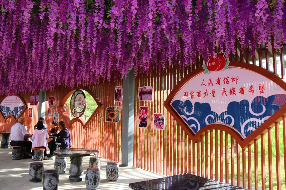 “石榴花开广场”占地面积2200平方米,以三段古朴大气的木质弧形廊架,打造出一个圆形环廊环抱的开放式广场,通过景观小品、视频播放、文字图片、各类活动的开展等多种形式展现民族团结进步创建,寓意各族群众在思想上同心同德、目标上同心同向、行动上同心同行,象征着“中华民族一家亲、同心共筑中国梦”的愿景。广场在拥有宣传教育、活动集会、户外运动等功能的基础上,同时搭建了创建基地、示范基地、宣传基地、教育基地等重要平台,在充分保证广大人民群众享受公共设施和文化福利带来的便利的同时,也将成为各族群众了解党的民族理论政策的新阵地,加强各族群众交往交流交融的新平台。