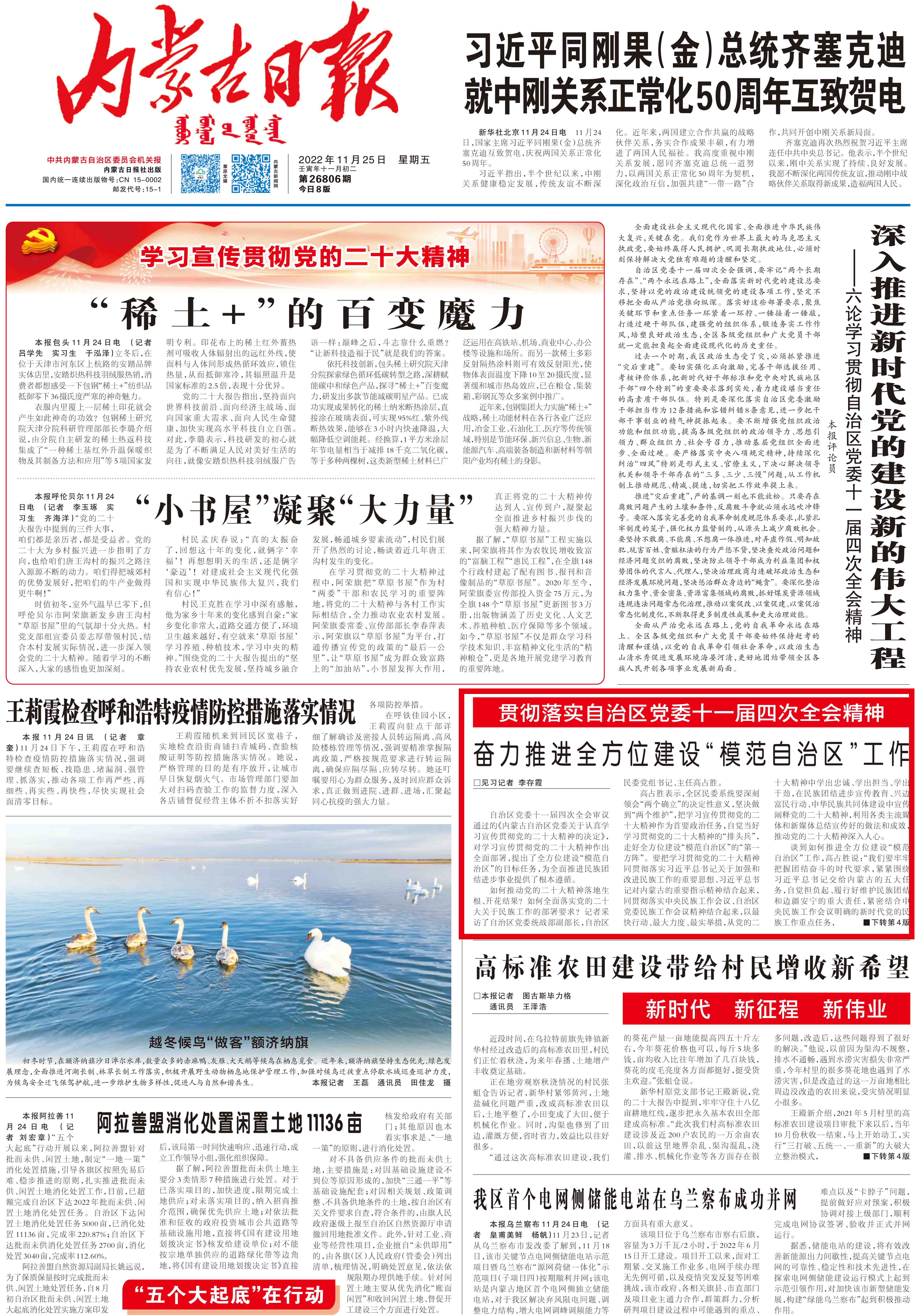 自治区党委十一届四次全会审议通过的《内蒙古自治区党委关于认真学习宣传贯彻党的二十大精神的决定》,对学习宣传贯彻党的二十大精神作出全面部署,提出了全方位建设“模范自治区”的目标任务,为全面推进民族团结进步事业提供了根本遵循。
