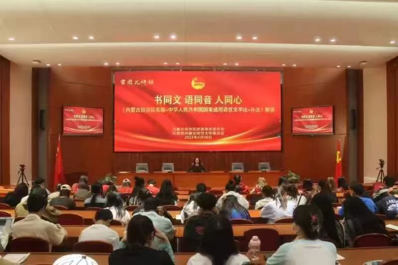 活动在内蒙古师范大学进行。邀请《内蒙古自治区实施<中华人民共和国国家通用语言文字法>办法》起草专班组长内蒙古大学许晋教授作了《内蒙古自治区实施<中华人民共和国国家通用语言文字法>办法》解读专题讲座。许晋教授从背景、内容及国家通用语言文字重要作用等方面,进行全方位、多角度、深层次的细致解读,为大家全面理解、准确把握、认真落实《内蒙古自治区实施<中华人民共和国国家通用语言文字法>办法》,起到积极推动作用。通过讲座,大家深刻认识到推广普及国家通用语言文字,科学保护各民族语言文字,尊重和保障少数民族语言文字学习和使用是做好民族工作、增进民族团结、维护国家安全和统一的长久之策、固本之举,纷纷表示要切实将中华民族共同体意识内化于心、外化于行,坚定不移感党恩、听党话、跟党走。
