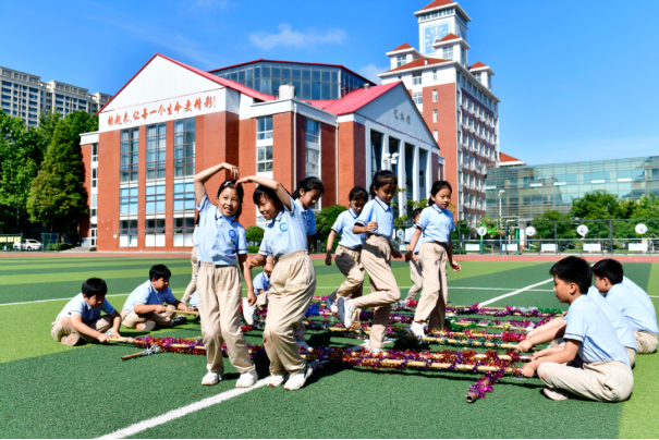 ▲6月21日,山东省日照市金海岸小学的学生们体验竹竿舞。新华社记者 郭绪雷摄